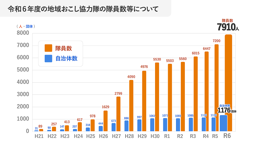 令和6年度の隊員数は全国で7,910人。令和8年までには10,000人を目標として各地域が取組を進めています。直近5年に任期終了した隊員の約7割が任期終了後も定住しており、地域での起業につながるケースも数多くあります。