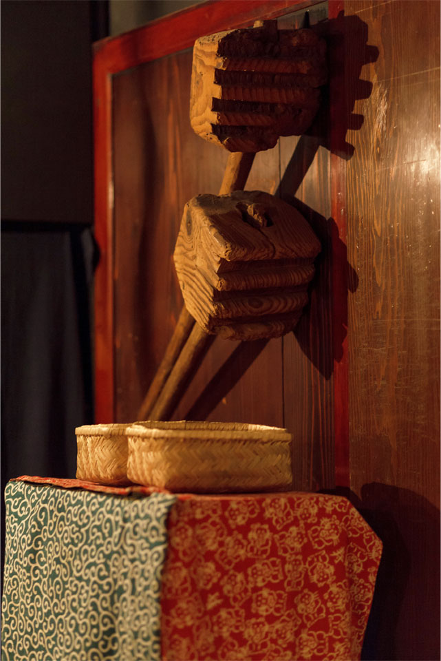 マタギの古民家を訪れたかのような、古風でぬくもりのある空間になるよう、床は畳、障子戸や木材を使った小物を多用しています。